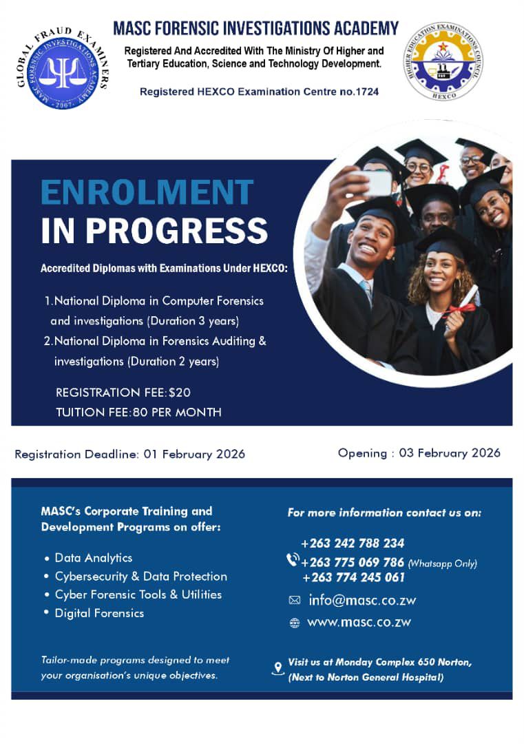 Masc Forensic Investigations Academy is registered with the Ministry of Higher & Tertiary Education, Science & Technology Development.